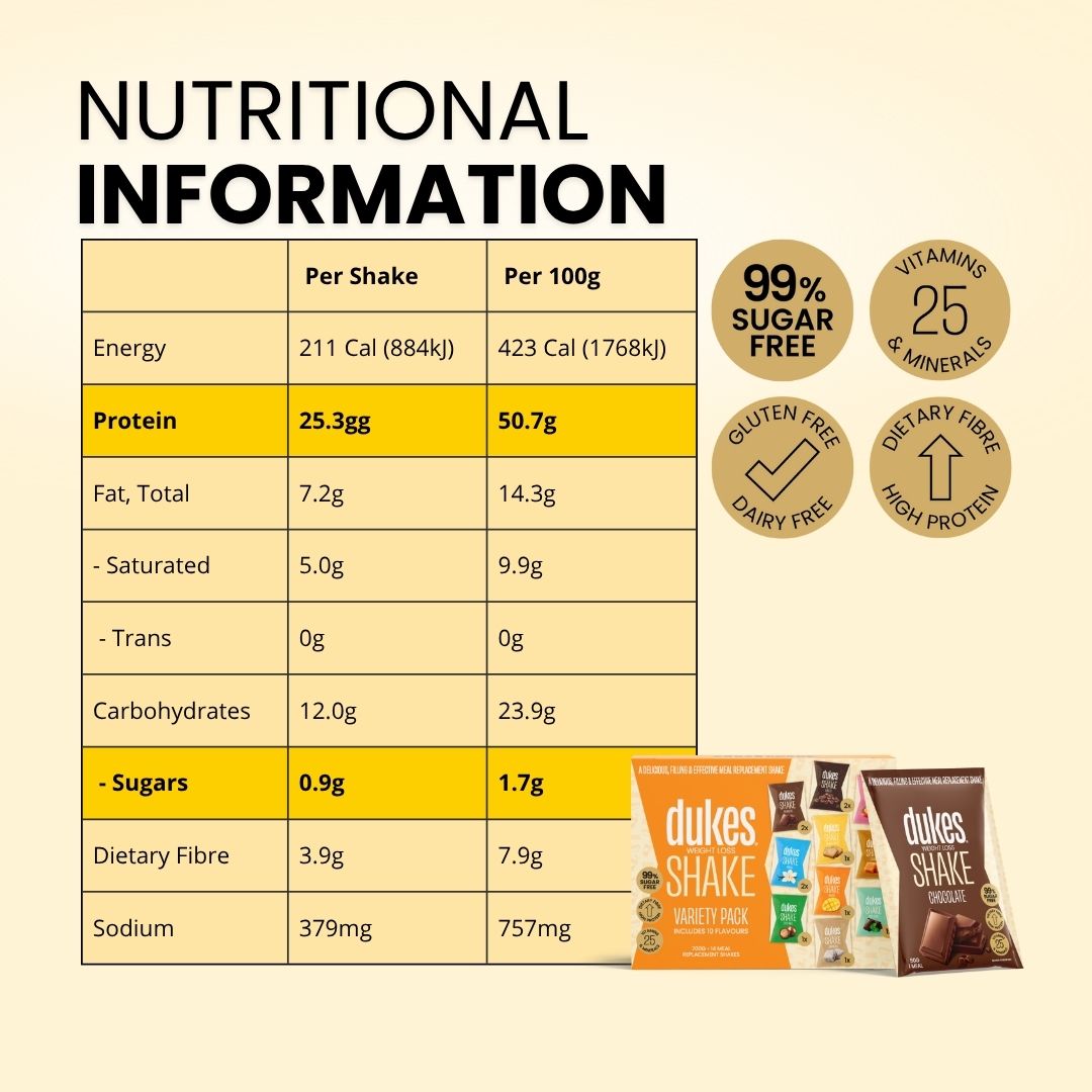 The Dukes Weight Loss Shakes are packed with 25 grams of protein which will keep you feeling full as well as helping to maintain and build muscle mass.